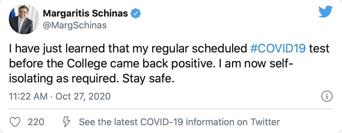“Μόλις έμαθα ότι το τακτικό προγραμματισμένο τεστ μου για κορονοϊό πριν από το Κολλέγιο βγήκε θετικό. Βρίσκομαι σε αυτοπεριορισμό όπως απαιτείται”, έγραψε ο αντιπρόεδρος της Κομισιόν, που έστειλε και ένα μήνυμα προς τον κόσμο: “Μείνετε ασφαλείς”.