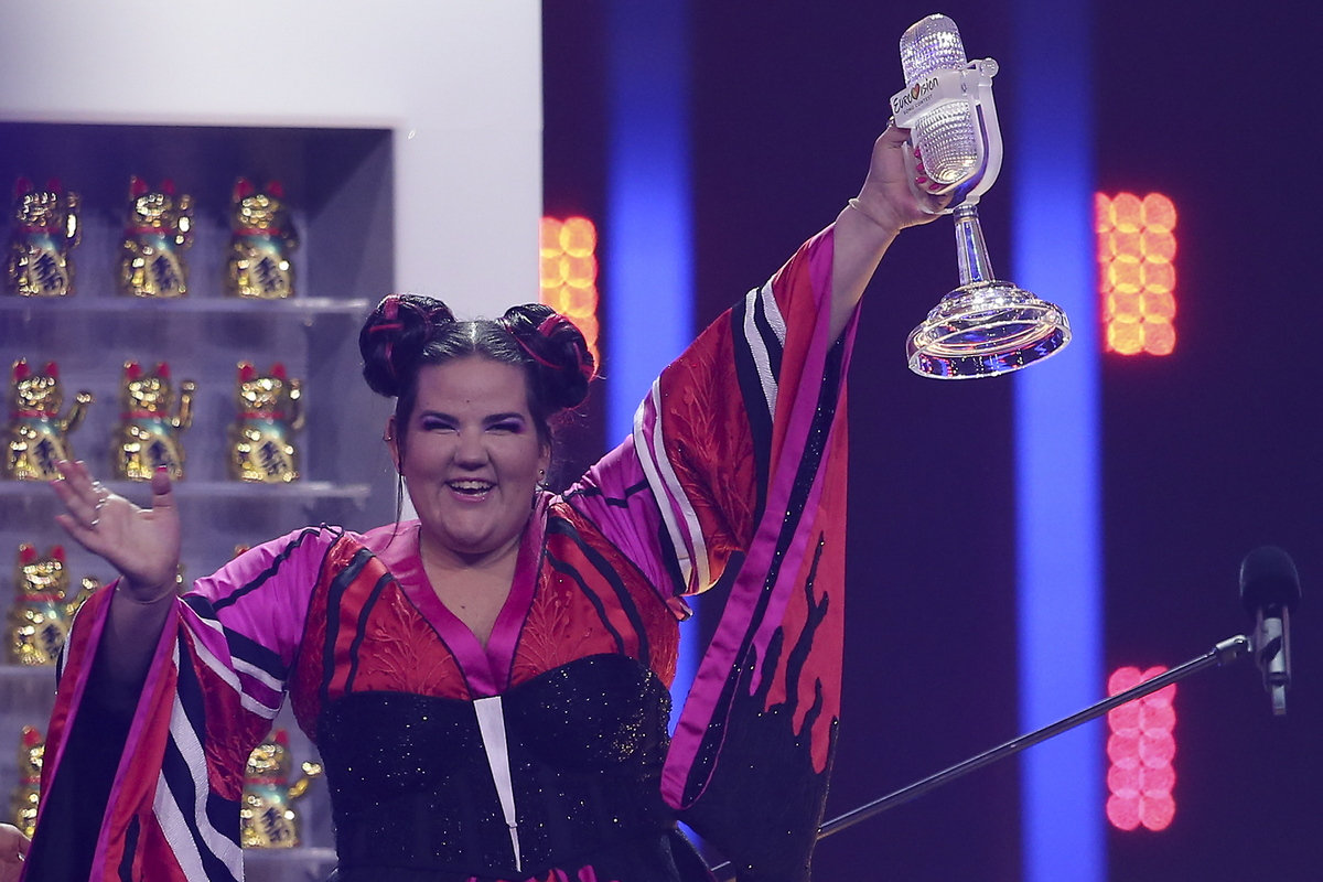 epa06732245 Netta (R) from Israel celebrates with the trophy after winning the Grand Final of the 63rd annual Eurovision Song Contest (ESC) at the Altice Arena in Lisbon, Portugal, 12 May 2018. Twenty-six finalists competed for the ESC 2018. EPA/JOSE SENA GOULAO