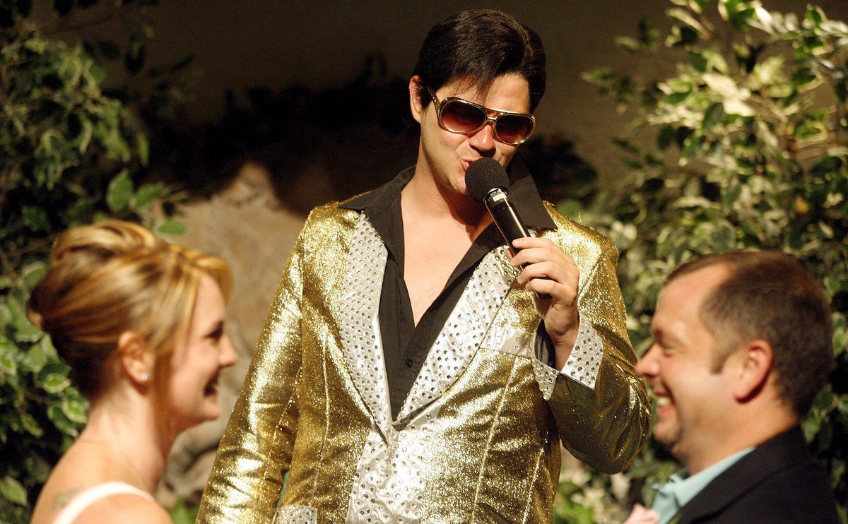 epa01092114 Elvis Presley impersonator Gary Alexander performs a wedding ceremony between Sara Blackburn and James Crowley of New Jersey at the Viva Las Vegas Wedding Chapel in Las Vegas, Nevada 15 August 2007. Thursday is the 30th anniversary of Presley's death. EPA/ISAAC BREKKEN