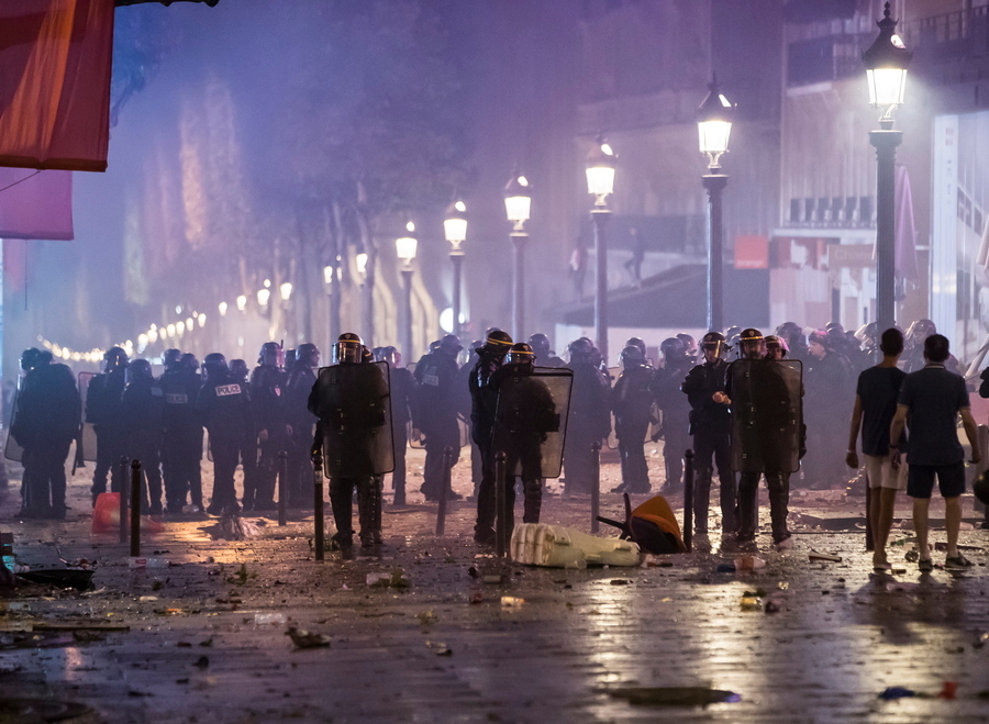 Οι σποραδικές αψιμαχίες συνεχίστηκαν ανάμεσα σε άνδρες των δυνάμεων επιβολής της τάξης και νεαρούς που «τα έσπαγαν», με εκσφενδονίσεις μπουκαλιών, ή καθισμάτων, εναντίον αστυνομικών που απαντούσαν κάνοντας χρήση δακρυγόνων. Το Σαμπ Ελιζέ προοδευτικά άδειασε από τους εκατοντάδες χιλιάδες πολίτες που γιόρτασαν τη νίκη των Μπλε στον τελικό και, περί τις 23:30 (00:30 ώρα Ελλάδας) οι δυνάμεις επιβολής της τάξης έκαναν χρήση εκτοξευτήρων νερού υπό πίεση για να διαλύσουν τους ταραξίες.