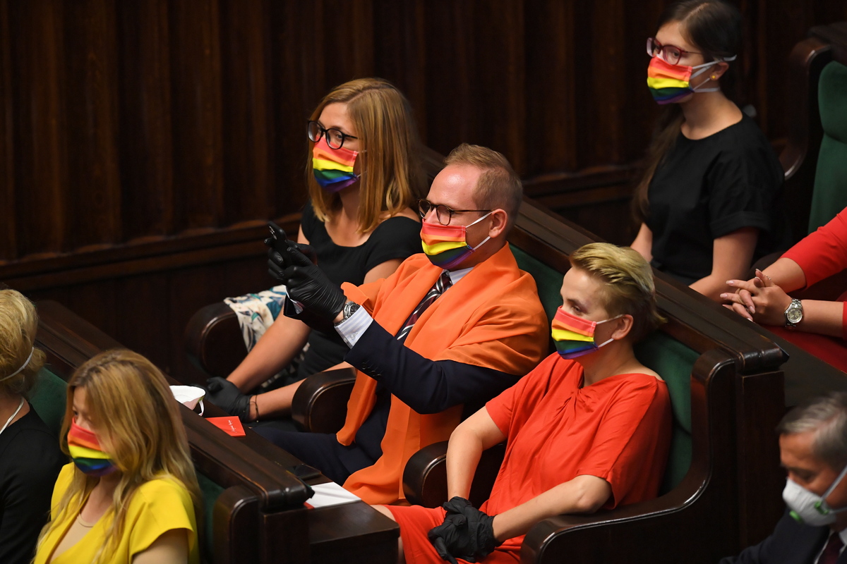 epa08587656 Opposition MPs wear outfits in rainbow colors during the swearing-in ceremony before the National Assembly of the Republic of Poland, a joint session of the Sejm (lower house) and Senate in Warsaw, Poland, 06 August 2020. President Andrzej Duda will start a second term after winning the presidential election held on 12 July, in which he defeated Rafal Trzaskowski, the candidate of the Civic Coalition. EPA/RADEK PIETRUSZKA POLAND OUT