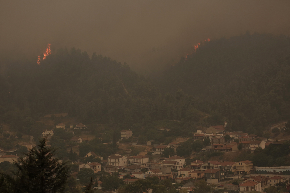 Φλόγες πλησιάζουν τα σπίτια κατά τη διάρκεια της πυρκαγιάς στο χωριό Γούβες στην Εύβοια, Κυριακή 08 Αυγούστου 2021. Ένα τεράστιο μέτωπο της φωτιάς κατευθύνεται αυτή την ώρα στην Γαλατσώνα και βρίσκεται σε απόσταση αναπνοής από το χωριό. Ένα άλλο πύρινο μέτωπο πλησιάζει τις Γούβες σε μία πορεία που οδηγεί στο Αρτεμίσιο, το Πευκί και τη θάλασσα. Λίγο μακρύτερα και από την άλλη πλευρά του νησιού, η φωτιά κινείται κατευθείαν προς τους Καματριάδες και τους Γαλατσάδες - και αν περάσει από αυτά τα δύο κομβικά σημεία, πλέον θα βρεθεί πάνω από την Αιδηψό. Στο νότιο τμήμα, οι υποστηρικτικές ομάδες πυροπροστασίας που έχουν φτάσει στη χώρα μας από την Ουκρανία και την Ρουμανία και εργάζονται νυχθημερόν, ελέγχουν την κατάσταση στο χωριό Τρούπι, όσο και λίγο πιο βόρεια, στα Καλύβια και στο Σπαθάρι. ΑΠΕ-ΜΠΕ/ΑΠΕ-ΜΠΕ/ΚΩΣΤΑΣ ΤΣΙΡΩΝΗΣ