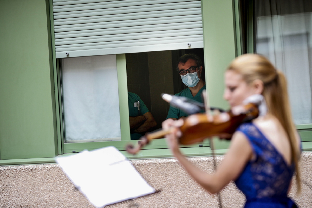 epa08417183 Health care professionals enjoy the performance of the italian violinist Fiamma Flavia Paolucci that celebrates the International Nurses Day at the Policlinico di Tor Vergata Hospital during the COVID-19 coronavirus pandemic, in Rome, Italy, 12 May 2020. EPA/GIUSEPPE LAMI