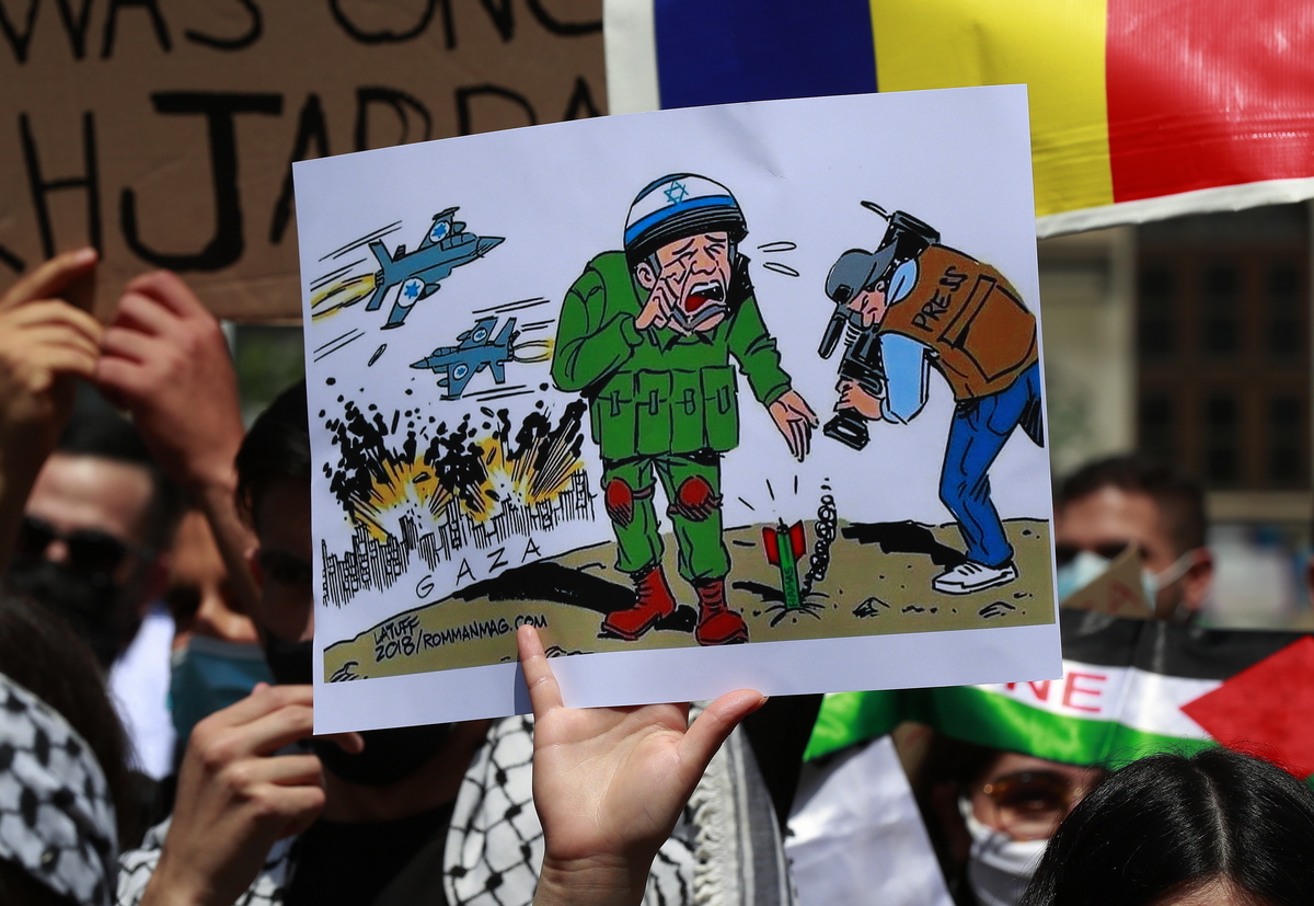 epa09201825 Protesters wave placards depicting Israeli-Palestinian violence escalation during a pro-Palestinian demonstration at University Plaza, in Bucharest, Romania, 15 May 2021. The recent clashes between Palestine and Israel have prompted international calls for calm and raised fears that the situation could ignite into a wider conflict. Protesters called for a free Palestine in response to days of violent confrontations between Israeli security forces and Palestinians that resulted, according to local health authorities with at least 140 people killed in Gaza and seven in Israel. EPA/ROBERT GHEMENT