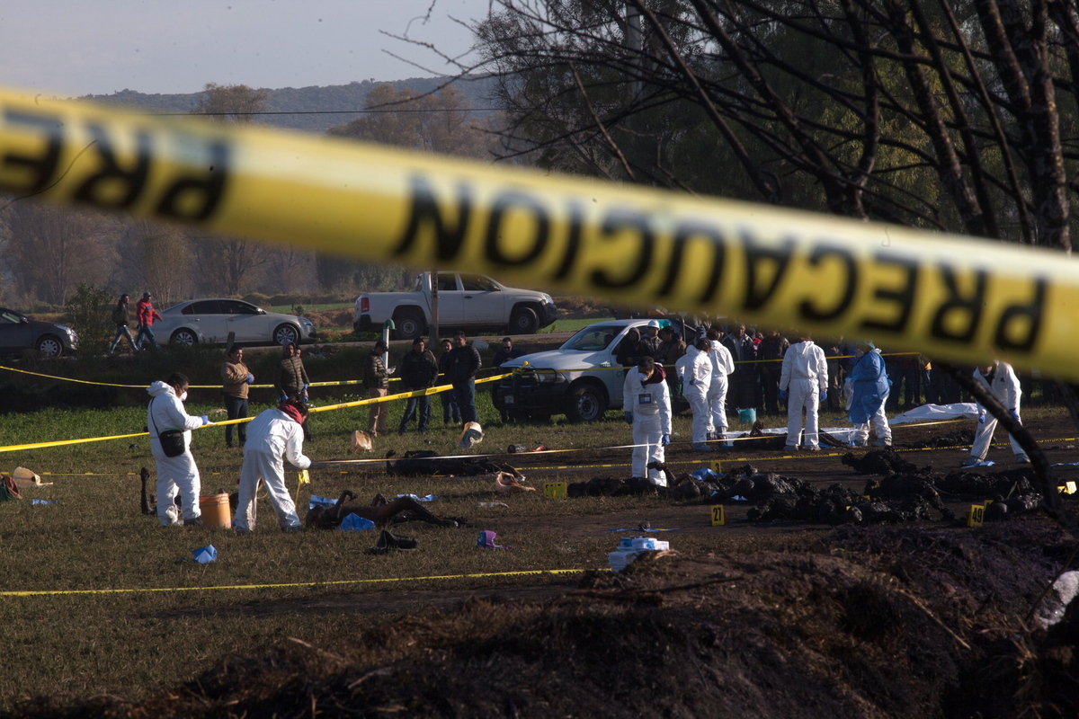 epa07301662 Forensic experts examine the area after an explosion at an illegal tap on Mexican oil company Pemex's pipeline in Tlahuilipan, state of Hidalgo, Mexico, 19 January 2019. At least 67 people died and 75 otherS were injured, according to official sources. EPA/MLA ATENCIÓN EDITORES CONTENIDO GRÁFICO EXPLÍCITO