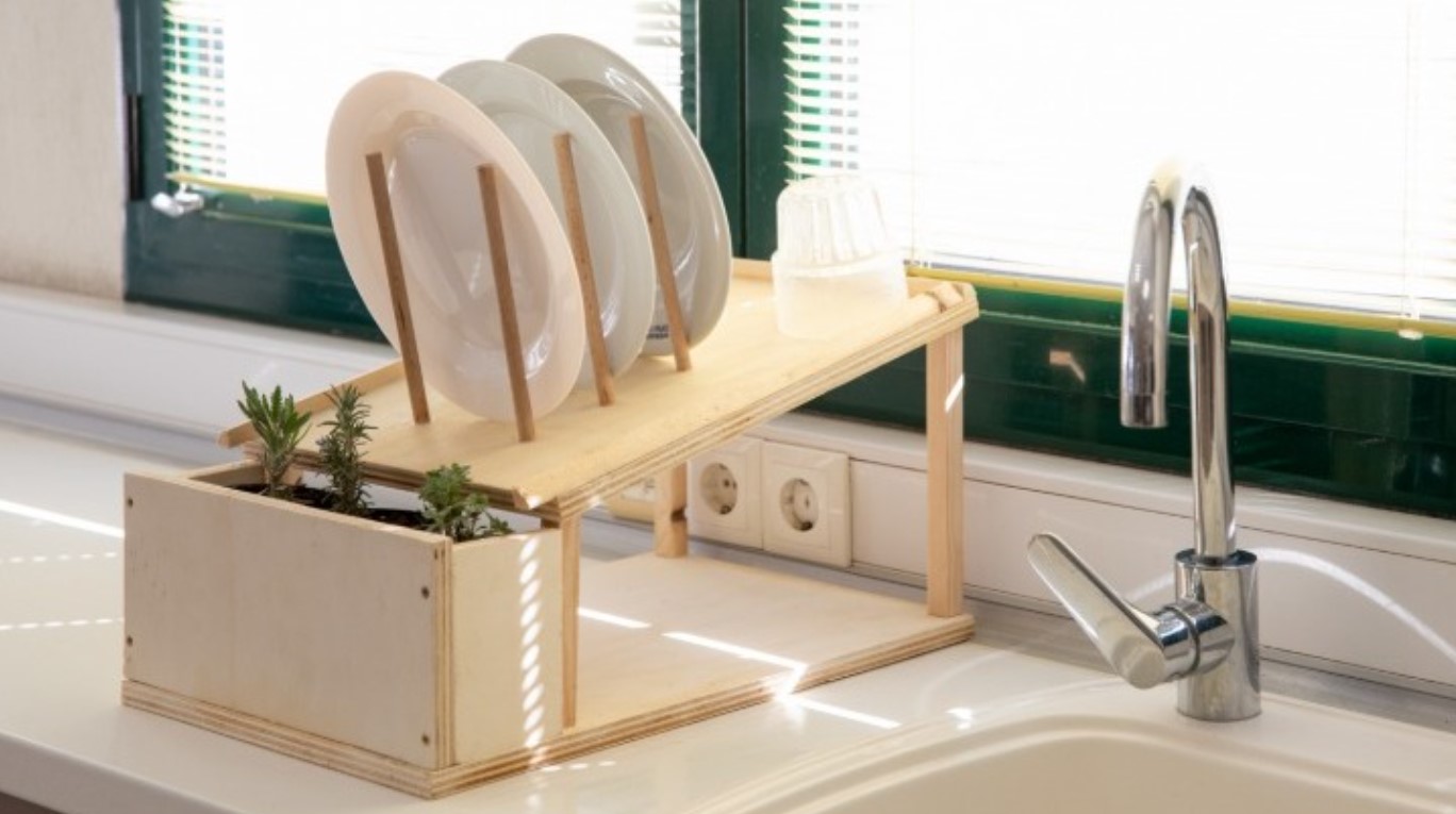 Το υλικό της πιατοθήκης έχει πολλές διαφορετικές στρώσεις ξύλου, με αποτέλεσμα να μην είναι απορροφητικό και το νερό να γλιστράει στην επιφάνειά του. Με την ειδική κλίση που έχει, στραγγίζει όλο το νερό σε μία ειδική -επίσης ξύλινη- ενσωματωμένη υποδοχή, όπου μπορούν να τοποθετηθούν γλάστρες.
