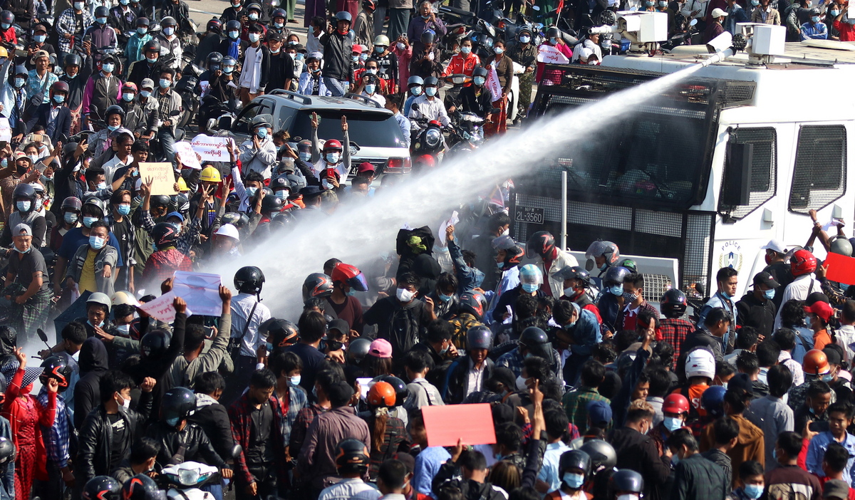 epaselect epa08995534 Police fire a water cannon at demonstrators during a protest against the military coup in Naypyitaw, Myanmar, 08 February 2021. Thousands of people took to the streets of Yangon and other cities, for a third day of mass protests against the military coup. Myanmar's military seized power and declared a state of emergency for one year after arresting State Counselor Aung San Suu Kyi and Myanmar president Win Myint in an early morning raid on 01 February. EPA/MAUNG LONLAN