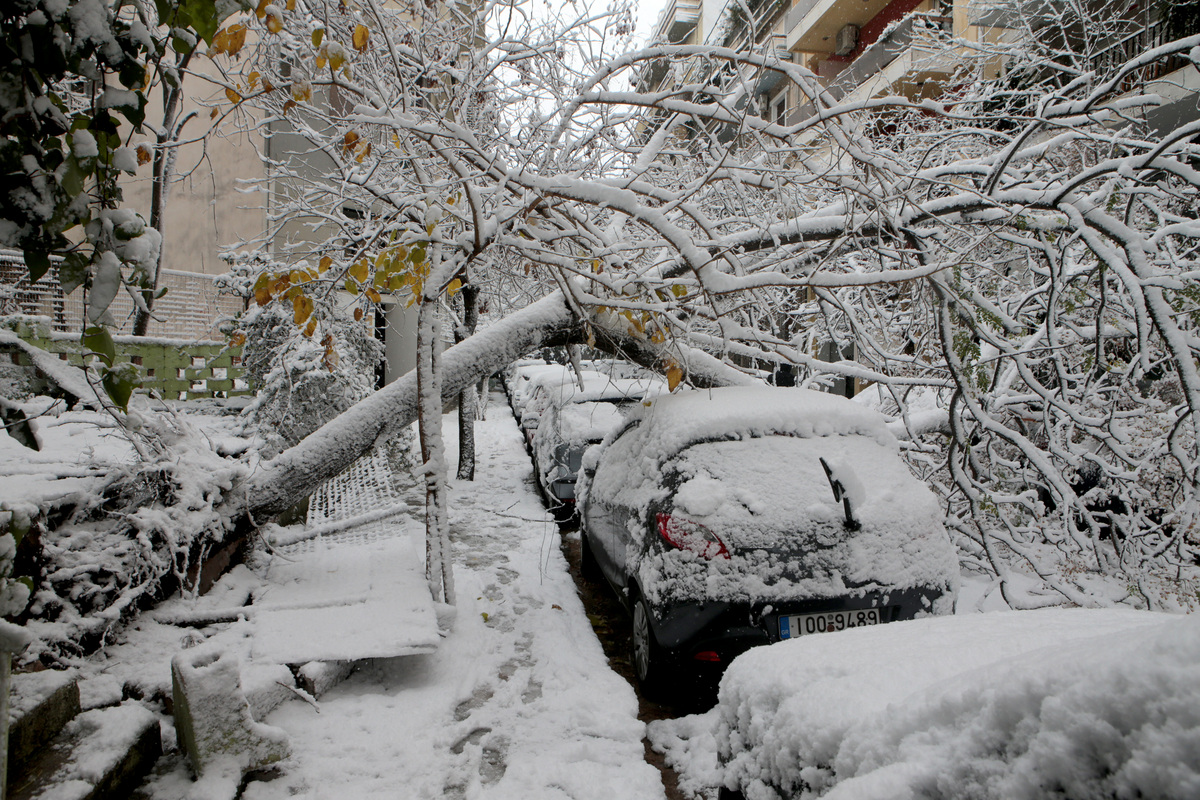 Δένδρο έχει πέσει από το βάρος του χιονιού σε σταθμευμένο αυτοκίνητο στο Παγκράτι.