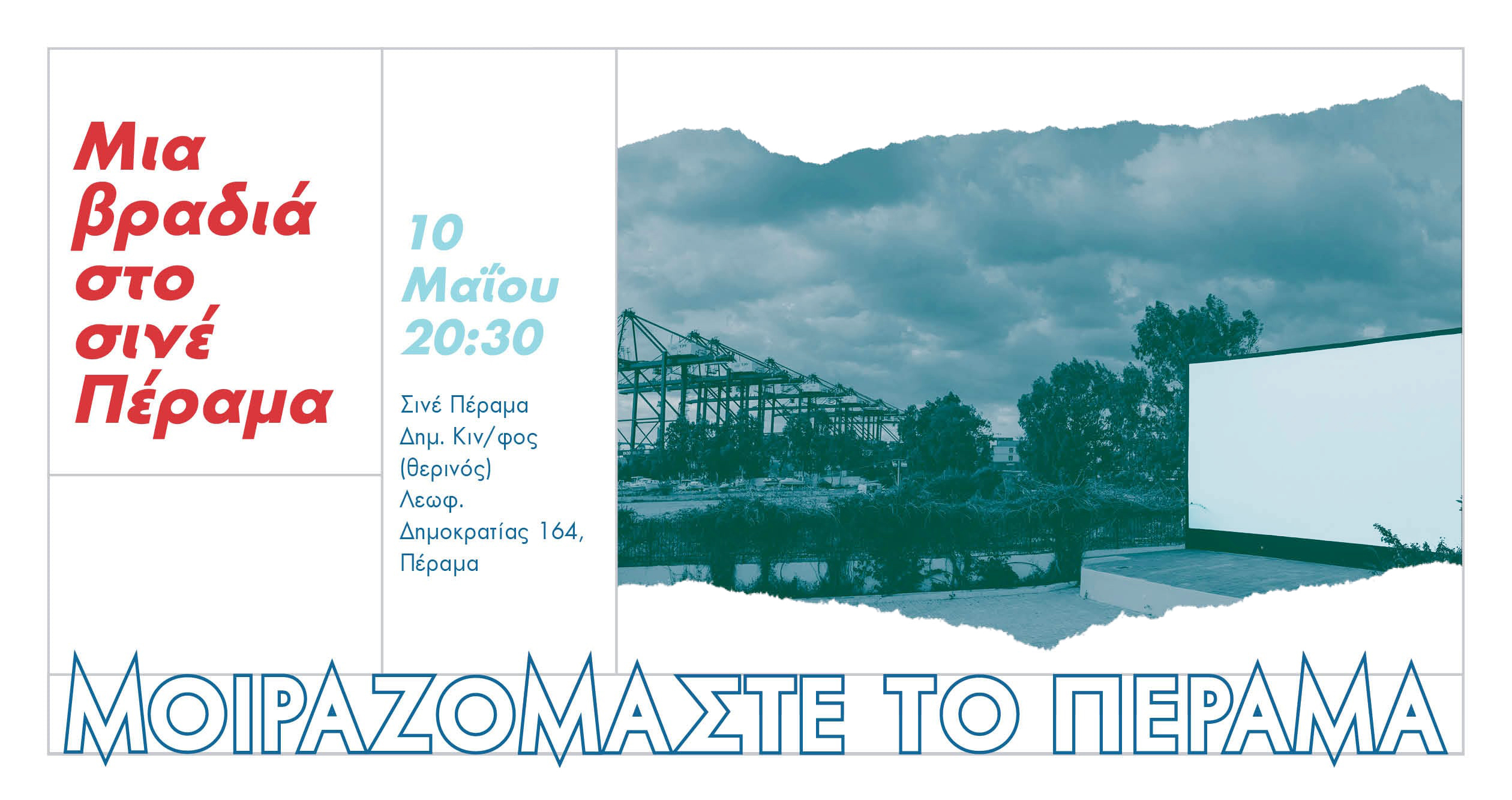 Το ΜΟΙΡΑΖΟΜΑΣΤΕ ΤΟ ΠΕΡΑΜΑ (“SHARING PERAMA”) σε συνεργασία με τον Δήμο Περάματος και την υποστήριξη του British Council, της Πρεσβείας της Ελβετίας, και του Outset Contemporary Art Fund (Greece) προγραμματίζουν την πρώτη δημόσια εκδήλωση του εγχειρήματος, υπό τον τίτλο, «Μια βραδιά στο Σινέ-Πέραμα» την Παρασκευή 10 Μαΐου 2019, στις 20:30 στον Δημοτικό θερινό κινηματογράφο «Σινέ-Πέραμα».