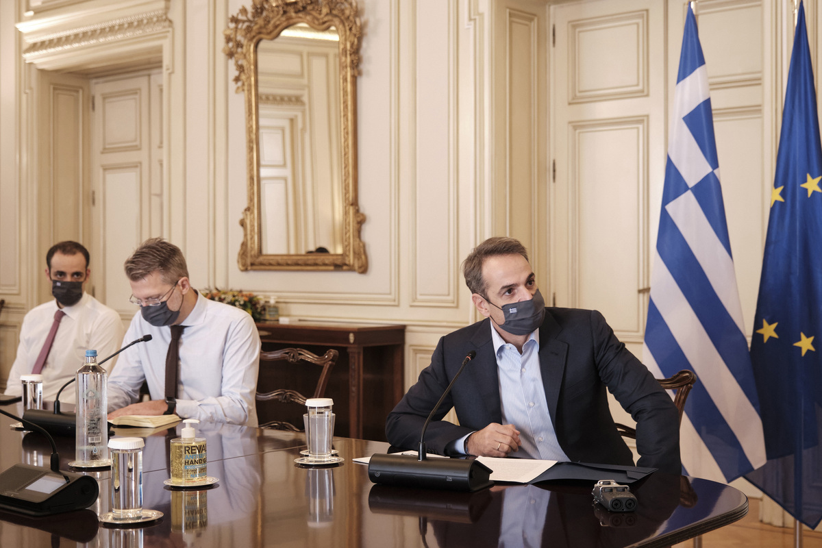 (Ξένη Δημοσίευση) Ο πρωθυπουργός Κυριάκος Μητσοτάκης (Δ) συμμετέχει, μέσω τηλεδιάσκεψης, στη σύσκεψη για τη στρατηγική εμβολιασμού για την αντιμετώπιση της πανδημίας covid-19, Παρασκευή 13 Νοεμβρίου 2020. Η Ελλάδα θα λάβει περισσότερα από 25 εκατομμύρια δόσεις εμβολίων κατά του Covid-19 μέσω των συμβάσεων προαγοράς που έχει υπογράψει η Ευρωπαϊκή Ένωση με φαρμακευτικές εταιρείες, ενώ οι πρώτες παραδόσεις αναμένονται στις αρχές του 2021. Ο πρωθυπουργός τόνισε ότι το εμβόλιο θα είναι δωρεάν για όλους τους πολίτες. Στη σύσκεψη έλαβαν μέρος ο Υπουργός Υγείας Βασίλης Κικίλιας, ο Υπουργός Επικρατείας και Ψηφιακής Διακυβέρνησης Κυριάκος Πιερρακάκης, ο Υπουργός Επικρατείας Γιώργος Γεραπετρίτης, ο Υφυπουργός Υγείας Βασίλης Κοντοζαμάνης, ο Υφυπουργός παρά τω Πρωθυπουργώ αρμόδιος για το Συντονισμό του Κυβερνητικού Έργου Άκης Σκέρτσος, ο καθηγητής Σωτήρης Τσιόδρας, ο Γενικός Γραμματέας του Πρωθυπουργού Γρηγόρης Δημητριάδης, ο Γενικός Γραμματέας Πρωτοβάθμιας Φροντίδας Υγείας Μάριος Θεμιστοκλέους, ο Γενικός Γραμματέας Συντονισμού Θανάσης Κοντογεώργης, ο Διευθυντής του Γραφείου του Πρωθυπουργού σ