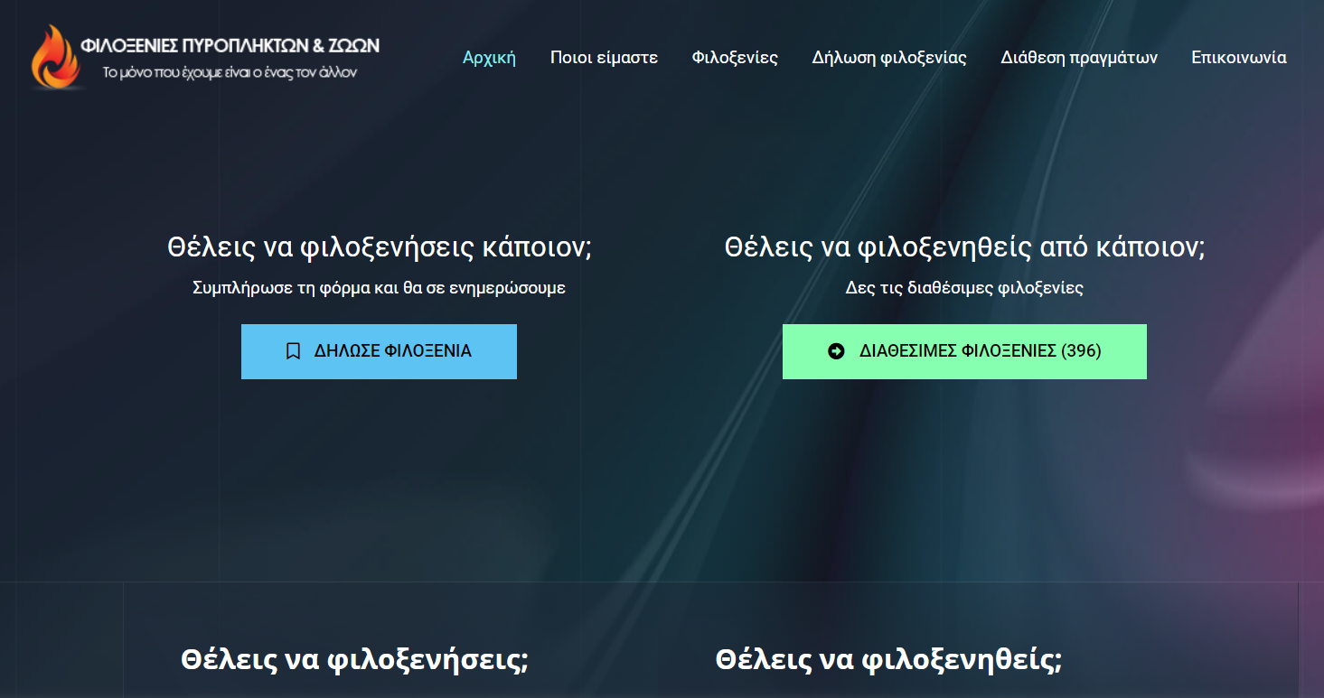 Σε αυτό το πνεύμα δημιουργήθηκε η ιστοσελίδα filoksenies.gr, μια πλατφόρμα για τη φιλοξενία πυρόπληκτων ανθρώπων και ζώων. Στην ιστοσελίδα, μπορεί κανείς να εκδηλώσει την πρόθεσή του να φιλοξενήσει πυρόπληκτους συνανθρώπους μας αλλά και πυρόπληκτα ζώα, είτε να αναζητήσει και να βρει διαθέσιμες προσφορές φιλοξενίας από αλληλέγγυους πολίτες, εφόσον ανήκει στους πληγέντες από τις καταστροφικές φωτιές του φετινού Αυγούστου. H ανταπόκριση του κόσμου φαίνεται πως είναι μεγάλη.
