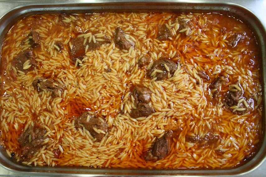 1) 1 κιλό μοσχάρι – ποντίκι, 2) 2 ξερά κρεμμύδια, 3) 2 σκελίδες σκόρδο, 4) 4 ντομάτες ή πελτέ ντομάτας, 5) 1 ποτήρι του κρασιού κόκκινο κρασί, 6) αλάτι, 7)πιπέρι, 8) ένα ξύλο κανέλας και 9) 1 πακέτο κριθαράκι.
