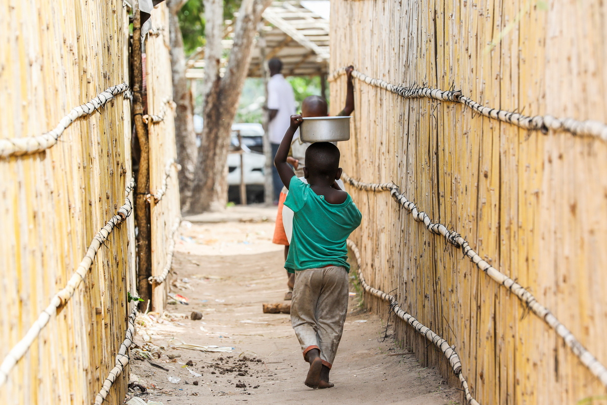 epaselect epa09127273 A young displaced boy carry a cooking pan in the Ntocota comunity relocated camp in Quilite, near Metuge, northern Mozambique, 10 April 2021. The violence unleashed more than three years ago in Cabo Delgado province escalated again about two weeks ago, when armed groups first attacked the town of Palma, forcing people to flee from a conflict zone. EPA/JOAO RELVAS