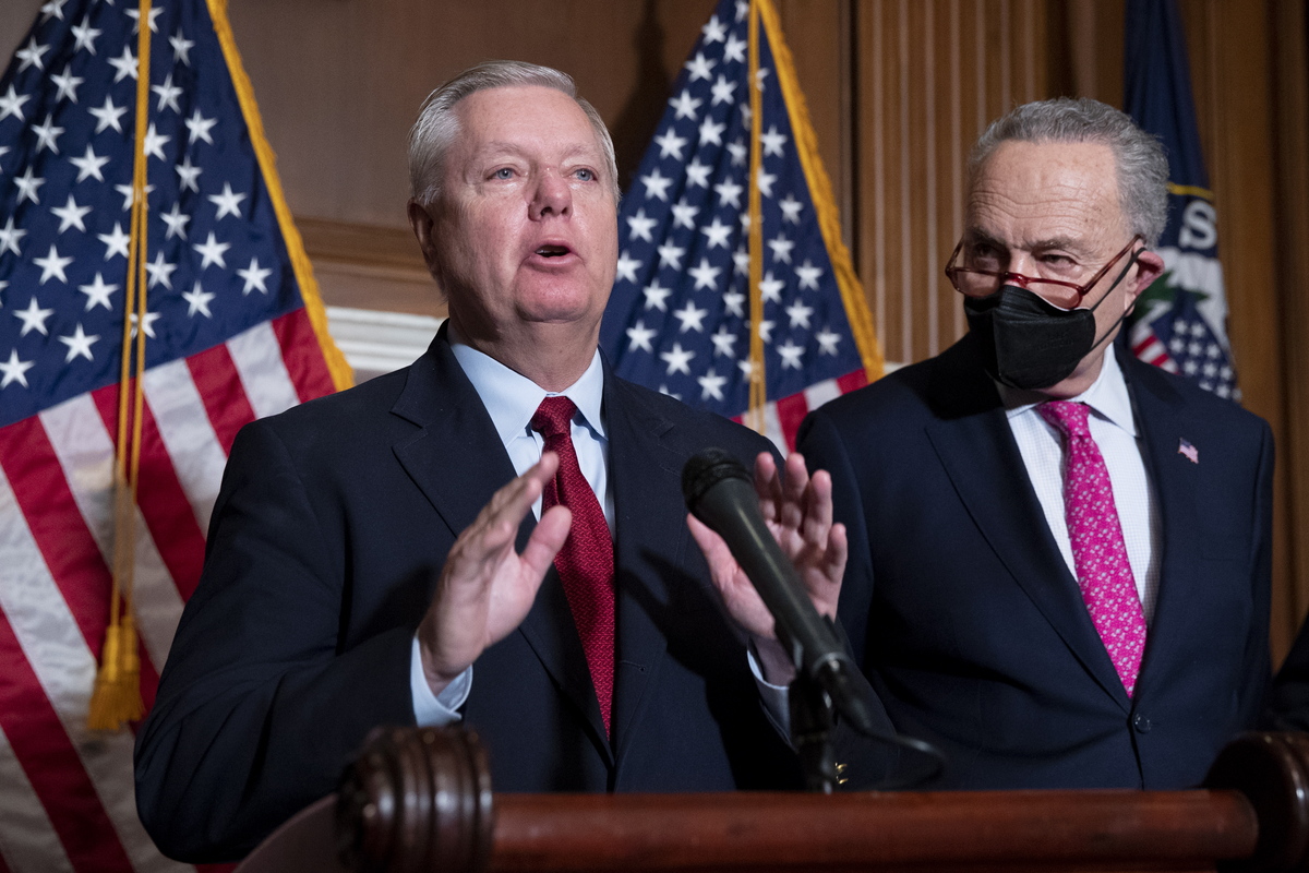epa09744656 Republican Senator from South Carolina Lindsey Graham (L) speaks beside Senate Majority Leader Chuck Schumer (R), during a news conference after the Senate passed the 'Ending Forced Arbitration of Sexual Assault and Sexual Harassment Act', on Capitol Hill in Washington, DC, USA, 10 February 2022. The legislation will allow sexual assault and sexual harassment survivors to choose between arbitration or court, invalidating existing forced arbitration clauses in employment contracts. EPA/MICHAEL REYNOLDS
