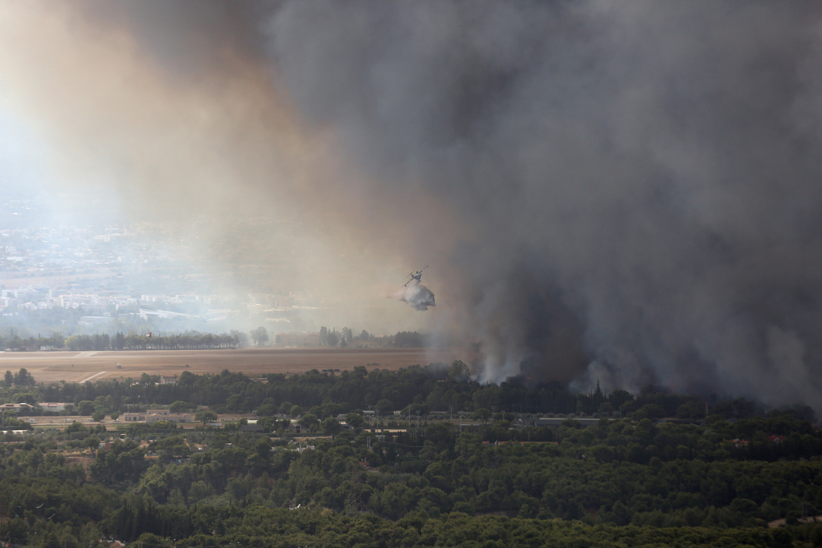 Πυροσβεστικό αεροσκάφος πραγματοποιεί ρίψεις νερού κατά τη διάρκεια της κατάσβεσης της πυρκαγιάς που ξέσπασε σε δασική έκταση στη Βαρυμπόμπη, Τρίτη 03 Αυγούστου 2021. Σε εξέλιξη είναι η πυρκαγιά σε δασική έκταση στην Βαρυμπόμπη, όπου οι ισχυρές πυροσβεστικές δυνάμεις δίνουν μάχη για να περιορίσουν την εξάπλωσή της, κυρίως με τα εναέρια μέσα που κάνουν συνεχώς ρίψεις νερού. Ταυτόχρονα η Πολιτική Προστασία έστειλε μήνυμα πριν από λίγο μέσω του ευρωπαϊκού αριθμού έκτακτης ανάγκης 112, στους κατοίκους της περιοχής να κλείσουν καμινάδες, πόρτες και παράθυρα για να μην μπουν καύτρες στα σπίτια τους. Υπενθυμίζεται ότι στο μέτωπο της πυρκαγιάς επιχειρούν 350 πυροσβέστες με 70 οχήματα, 10 ομάδες πεζοπόρων τμημάτων και από αέρος 4 ελικόπτερα και 4 αεροσκάφη μεταξύ των οποίων και το ρωσικό Beriev-200, ενώ συντονίζει ο αρχηγός του ΠΣ Στέφανος Κολοκούρης. Παράλληλα η Αστυνομία έχει διακόψει την κυκλοφορία λόγω της πυρκαγιάς στους δρόμους: Τατοΐου από Λ. Κύμης έως την οδό Ερυθραίας, στην Ερυθραίας από το ύψος της γέφυρας Βαρυμπόμπης και στην Τατοΐου από την οδό Πάρνηθος (Ιπποκράτειο Πολιτεία- ταβέρνα Λ