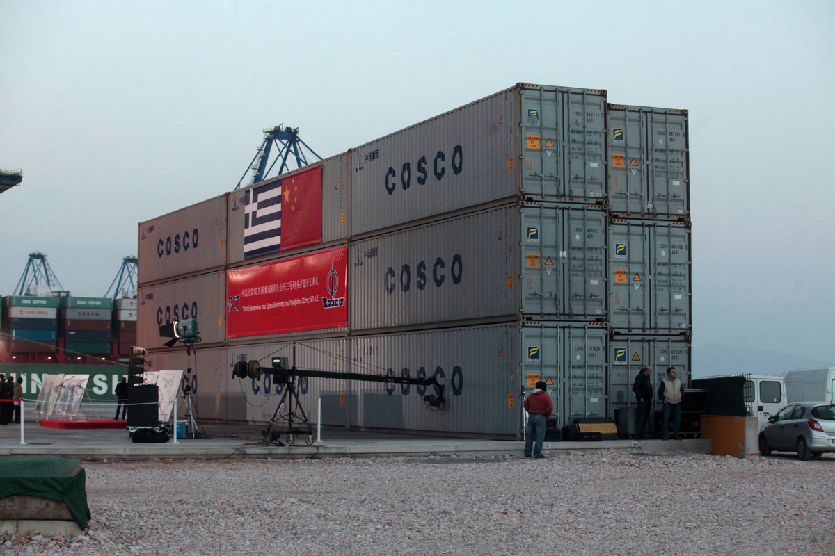 Κοντέϊνερ της COSCO με την Ελληνική και της Κινεζική σημαία, στο χώρο που θα γίνει η τελετή εγκανίων της επέκτασης του προβλήτα ΙΙΙ του Σταθμού Εμπορευματοκιβωτίων Πειραιά (ΣΕΠ ΑΕ) της COSCO, Πέμπτη 22 Ιανουαρίου 2015. ΑΠΕ - ΜΠΕ/ΑΠΕ - ΜΠΕ/Αλέξανδρος Μπελτές