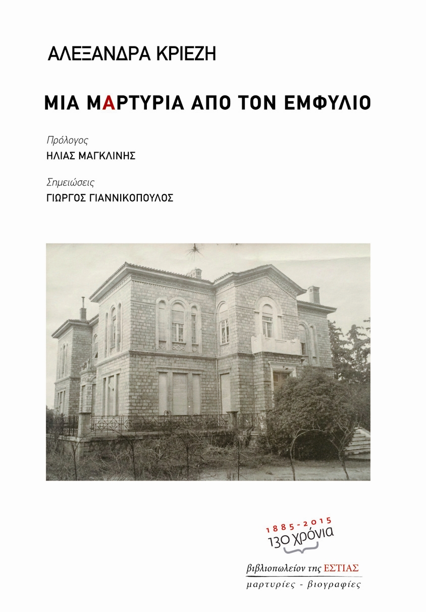 Μια μαρτυρία για τον Εμφύλιο, της Αλεξάνδρας Κριεζή. Πρόλογος: Ηλίας Μαγκλίνης, Σημειώσεις: Γιώργος Γιαννικόπουλος. Βιβλιοπωλείον της Εστίας. Πρώτη έκδοση: Δεκέμβριος 2015, Σειρά: Μαρτυρίες – βιογραφίες. Σελ. 124 , 14×20.5, τιμή: 12 ευρώ
