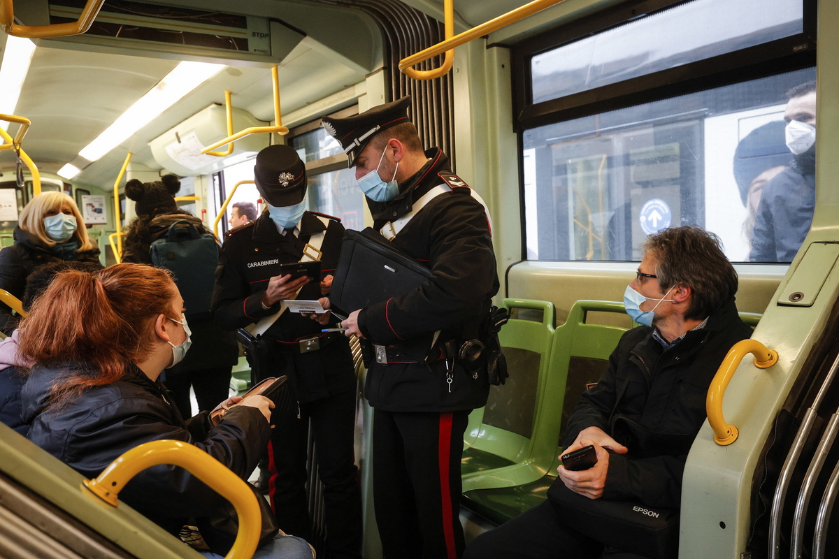 epa09625434 Italian Carabinieri police officers check the QR code confirming that people received the Covid-19 vaccine, at Fontivegge Station in Rome, Italy, 06 December 2021. The measures on the 'enhanced' green certificate (obtainable only with vaccination or recovery) come into effect from 06 December 2021 until 15 January 2022. EPA/GIUSEPPE LAMI