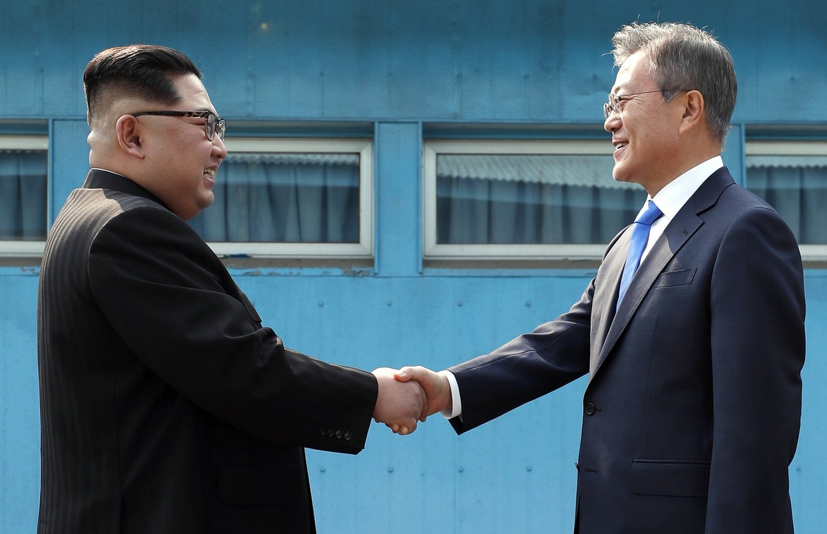 epa06695868 North Korean leader Kim Jong-un (L) shakes hands with South Korean President Moon Jae-in (R) between the military demarcation line (MDL), at the Joint Security Area (JSA) on the Demilitarized Zone (DMZ) in the border village of Panmunjom in Paju, South Korea, 27 April 2018. South Korean President Moon Jae-in and North Korean leader Kim Jong-un are meeting at the Peace House in Panmunjom for an inter-Korean summit. The event marks the first time a North Korean leader has crossed the border into South Korea sine the end of hostilities during the Korean War. EPA/KOREA SUMMIT PRESS POOL / POOL