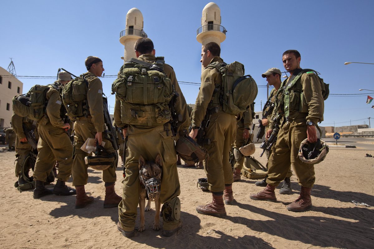 epa03260789 A squad of Israeli infantry soldiers, including a 'combat dog,' between the legs of its handler (C) gather in the square before the twin mosque minarets in the Israeli army's 'urban warfare' training base outside Ze'elim, southern Israel, 12 June 2012. The soldiers gathered at the conclusion of a large training exercise involving about 100 soldiers from different units who spent the night and early morning simulating various combat situations in an urban environment. EPA/JIM HOLLANDER