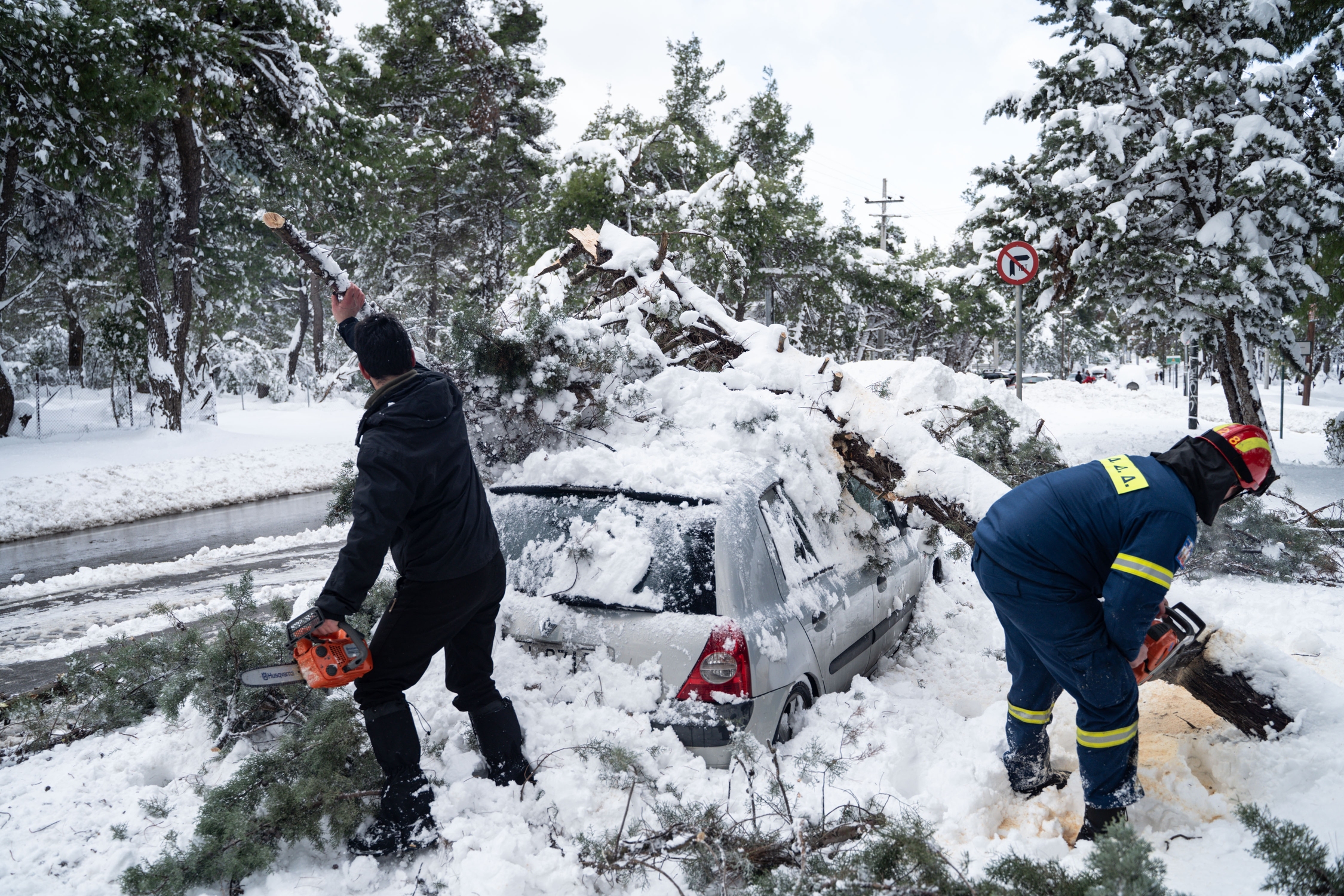 Άνθρωποι προσπαθούν να τραβήξουν από αυτοκίνητο ένα δέντρο που έπεσε κατά την διάρκεια της νύχτας, λόγω της σφοδρής χιονόπτωσης. Βόρεια προάστια, Τρίτη, 25 Ιανουαρίου 2022
