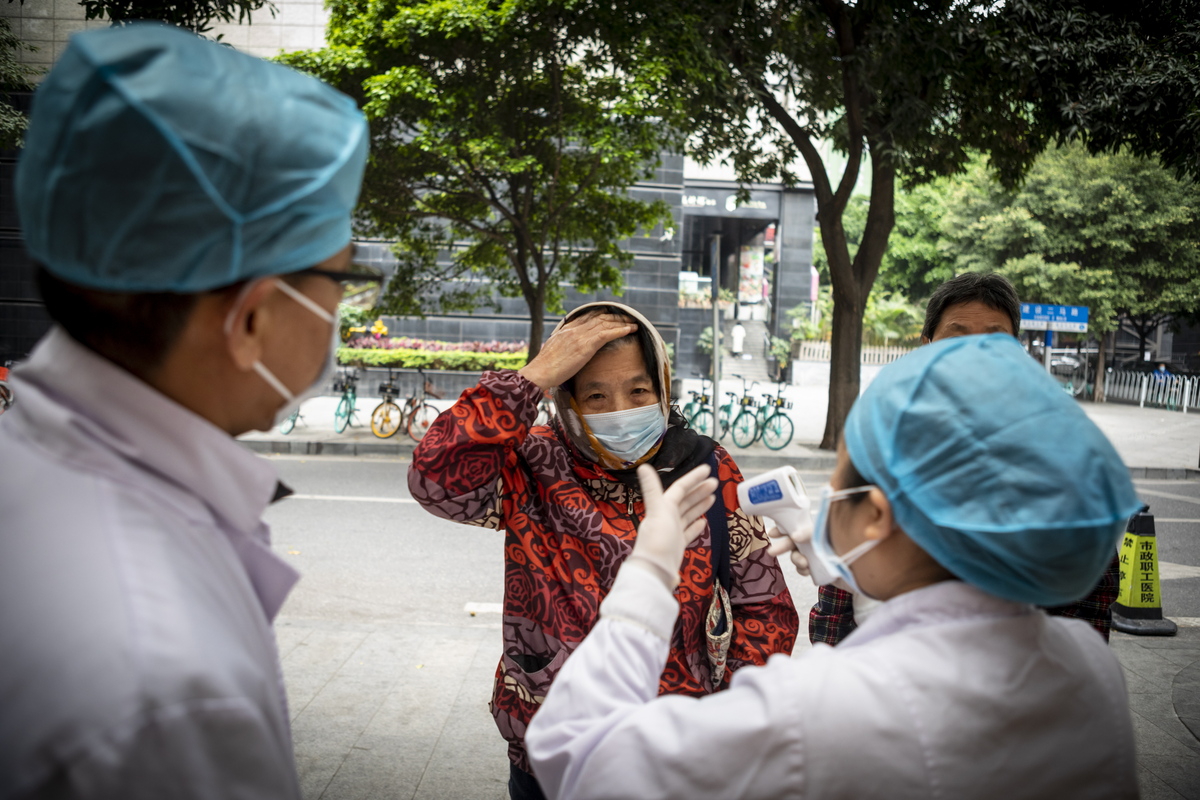 epa08189996 Medical personnel check the body temperature of people entering a community health center and pharmacy in Guangzhou, Guangdong Province, China, 03 February 2020. Wearing masks in metro and all public places in Guangzhou is mandatory and offenders faces penalties if they don't obey this law. As many as at least 24 provinces, municipalities and other regions have delayed the resumption of business by at least a week as the country tries to control the spread of a new coronavirus which killed as least 360 people in China, according to media reports. EPA/ALEX PLAVEVSKI