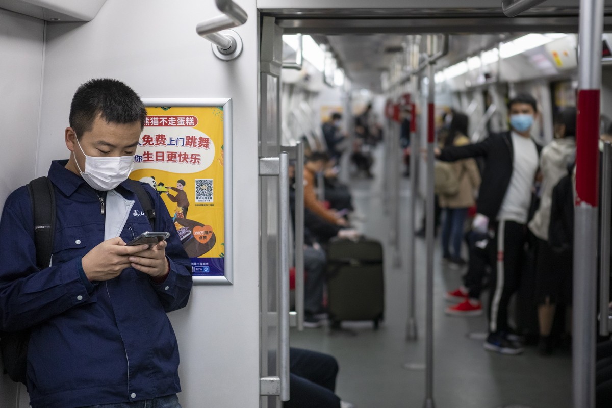 epa08190002 Passengers wear face masks in a subway in Guangzhou, Guangdong Province, China, 03 February 2020. Wearing masks in metro and all public places in Guangzhou is mandatory and offenders faces penalties if they don't obey this law. As many as at least 24 provinces, municipalities and other regions have delayed the resumption of business by at least a week as the country tries to control the spread of a new coronavirus which killed as least 360 people in China, according to media reports. EPA/ALEX PLAVEVSKI