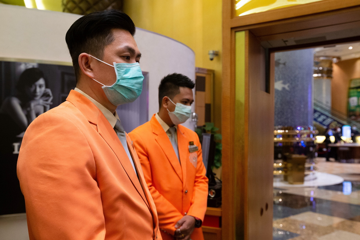 epa08228738 Casino workers wearing protective masks await customers as the Casino reopens in Macao, China, 20 February 2020. Twenty-nine casinos are to reopen starting 20 February, and 12 remain closed, the authorities of the gambling capital said, one of the regions that have identified cases of infection by the coronavirus Covid-19. After 15 days of closure, Macau's government said on 17 February that the casinos could reopen, giving operators 30 days to return to business. EPA/CARMO CORREIA