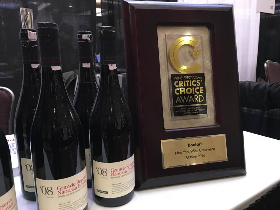 Tο Grand Reserve Naoussa Boutari 2008 ήταν φέτος το μοναδικό ελληνικό κρασί ανάμεσα σε 250 από 15 χώρες που απέσπασε το Wine Spectators Critics’ Award, στο Grand Tasting του New York Wine Experience, ένα μοναδικό παγκόσμιο οινικό γεγονός που καθιερώθηκε ως ετήσιος θεσμός για τους επαγγελματίες και καταναλωτές.