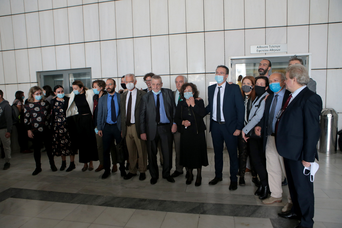 Η Μάγδα Φύσσα μαζί με τους συνηγόρους της πολιτικής αγωγής μετά το πέρας της δίκης της Χρυσής Αυγής και την ανακοίνωση των ποινών των κατηγορουμένων, Πέμπτη 22 Οκτωβρίου 2020. Η πρόεδρος του Τριμελούς Εφετείου Κακουργημάτων Μαρία Λεπενιώτη ανακοίνωσε τη λήξη των συνεδριάσεων για τη δίκη της Χρυσής Αυγής. Η ηγετική ομάδα της Χρυσής Αυγής δεν έχει ανασταλτικό αποτέλεσμα στις εφέσεις της. Τα ονόματα των πρώην βουλευτών της Χρυσής Αυγής, που οδηγούνται στη φυλακή: Νίκος Μιχαλολιάκος, Ηλίας Κασιδιάρης, Ιωάννης Λαγός, Χρήστος Παππάς, Ηλίας Παναγιώταρος, Γιώργος Γερμενής και Αρτέμης Ματθαιόπουλος ως διευθυντική ομάδα. Στη φυλακή οδηγούνται επίσης 14 συνεργοί του Γιώργου Ρουπακιά, καθώς και οι δύο πυρηνάρχες της οργάνωσης Γιώργος Πατέλης και Αναστάσιος Πανταζής. Συνολικά οδηγούνται στη φυλακή 38 από τους 50 καταδικασθέντες σε καθείρξεις, μεταξύ των οποίων και οι 13 πρώην βουλευτές. ΑΠΕ-ΜΠΕ/ΑΠΕ-ΜΠΕ/Παντελής Σαίτας