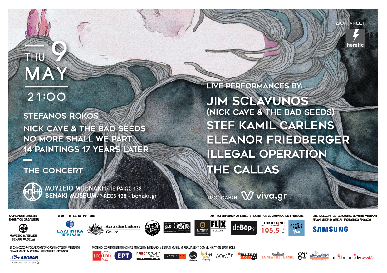 Το εγχείρημα του Στέφανου Ρόκου να προσεγγίσει εικαστικά το άλμπουμ των Nick Cave & The Bad Seeds “No More Shall We Part”, με την έκδοση ενός καλλιτεχνικού βιβλίου και τη μεγάλη έκθεση στο Μουσείο Μπενάκη, που ήδη έχουν επισκεφθεί εκατοντάδες κόσμου, «ολοκληρώνεται» και μουσικά με μια συναυλία στο αίθριο του Μουσείου, την Πέμπτη 9 Μαΐου.