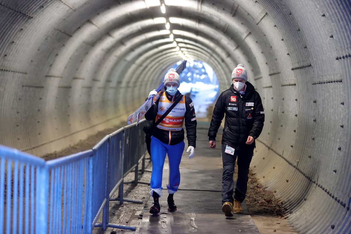 epa08973352 Halvor Egner Granerud (L) of Norway walks through a tunnel after the men's large hill individual qualification round of the FIS Ski Jumping World Cup in Willingen, Germany, 29 January 2021. EPA/FRIEDEMANN VOGEL