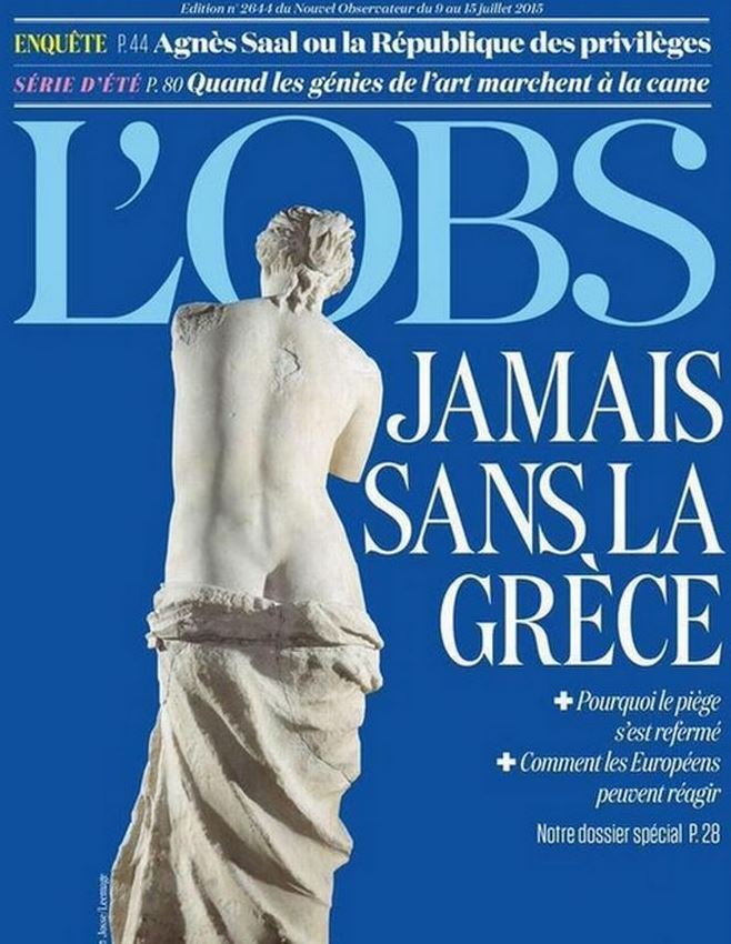 Το υπέροχο εξώφυλλο του Nouvel Observauteur με την Αφροδίτης της Μήλου και παραφράζοντας την πιο γνωστή ίσως ελληνική ταινία στο εξωτερικό – Ποτέ τη Κυριακή- «λέει» στους αναγνώστες του «Ποτέ χωρίς την Ελλάδα».