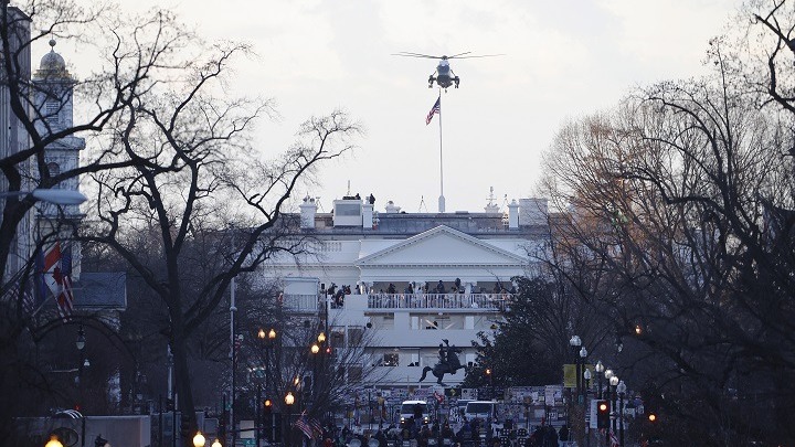 Ο Ντόναλντ Τραμπ αναχωρεί από τον Λευκό Οίκο επιβαίνοντας στο Marine One, το ελικόπτερο του Σώματος των Πεζοναυτών τον οποίο είχε προσγειωθεί στον κήπο του Λευκού Οίκου για να τον παραλάβει, λίγες ώρες πριν από την ορκωμοσία του Τζο Μπάιντεν στην προεδρία.