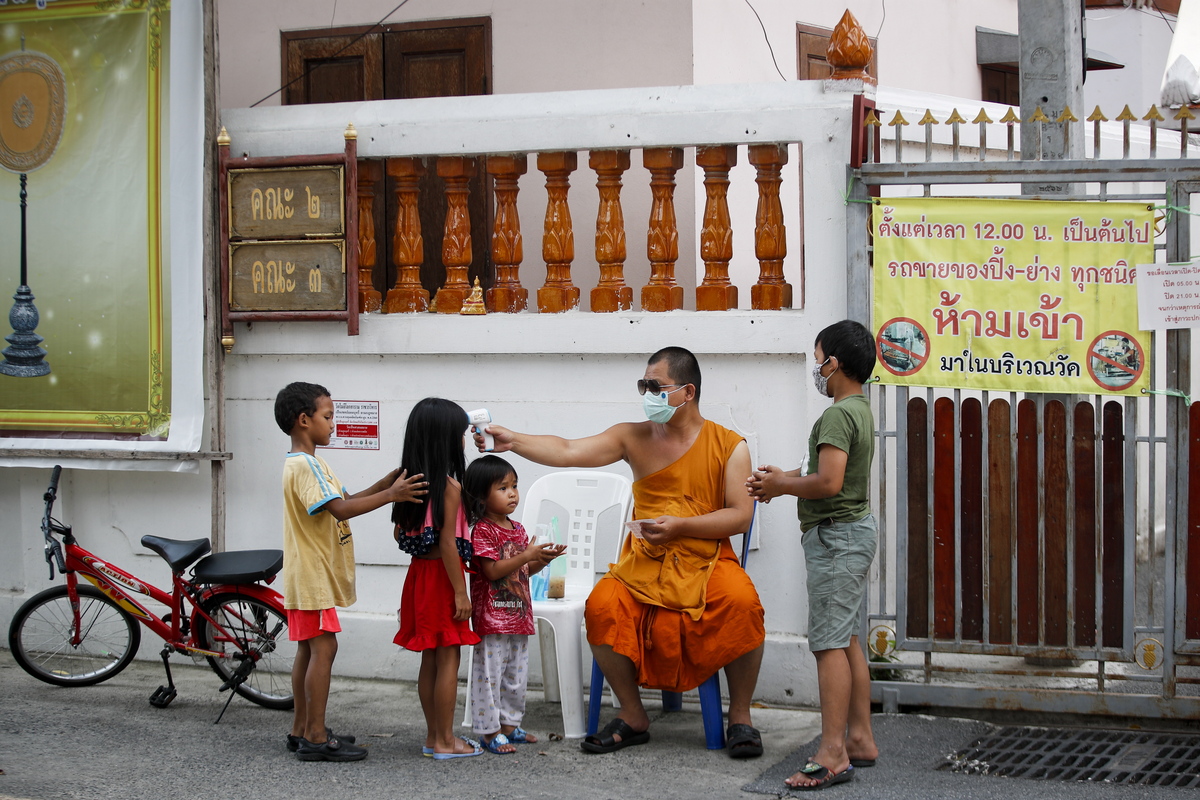 epaselect epa08386390 A Thai Buddhist monk takes the temperature of kids entering the Wat Molilokayaram in Bangkok, Thailand, 27 April 2020. The ongoing coronavirus and COVID-19 pandemic has forced people to adjust their daily routines after governments worldwide imposed travel restrictions, quarantine measures, curfews and lockdowns to stem the spread of the SARS-CoV-2 coronavirus which causes the COVID-19 disease. EPA/DIEGO AZUBEL