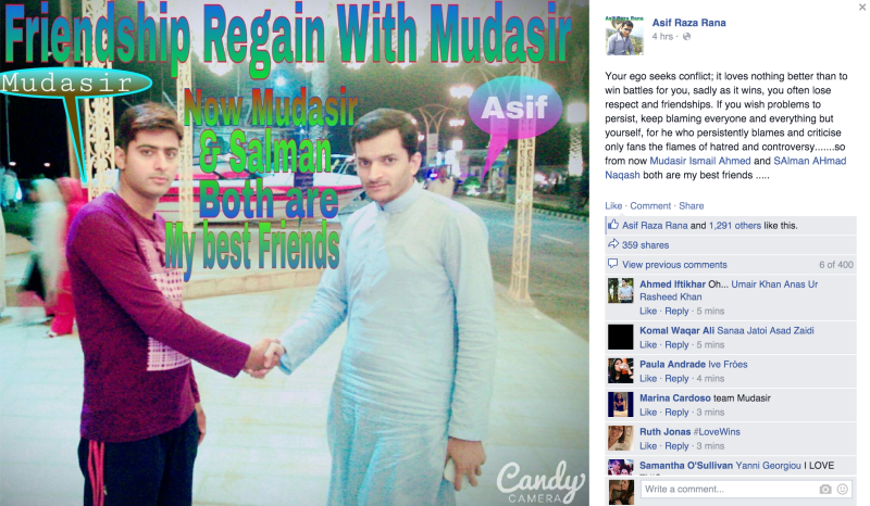 Ακριβώς πριν από ένα μήνα, ο εύθραστος κόσμος μας διαταράχτηκε όταν ένας χρήστης του Facebook, από την περιφέρεια του Πακιστάν, Gujranwala, ανακοίνωσε το τέλος της φιλίας του με τον πρώην καλύτερο του φίλο, Μουντασίρ, για χάρη του καινούριου καλύτερού του φίλου, Σαλμάν.Η ιστορία τους έγινε γνωστή μέχρι τα πέρατα της γης και πολλοί δάκρυσαν με το άδοξο τέλος αυτής της φιλίας.