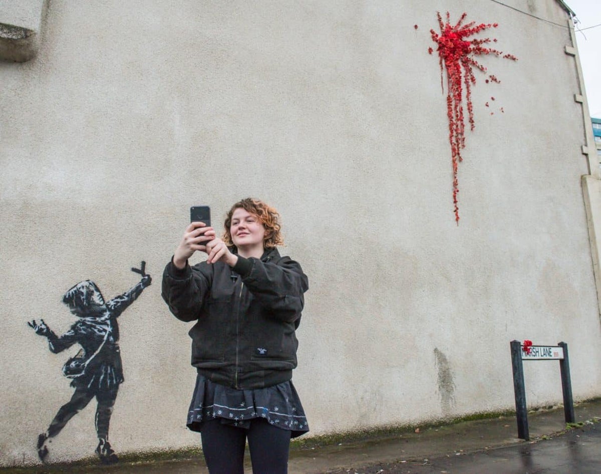 Ήδη, οι θαυμαστές του συρρέουν για να τραβήξουν selfies μπροστά στο έργο, στο οποίο απεικονίζεται ένα μικρό κοριτσάκι που έχει στρέψει μια σφεντόνα προς τον ουρανό, ενώ μια έκρηξη ζωηρόχρωμων κόκκινων λουλουδιών σχηματίζεται πιο ψηλά.