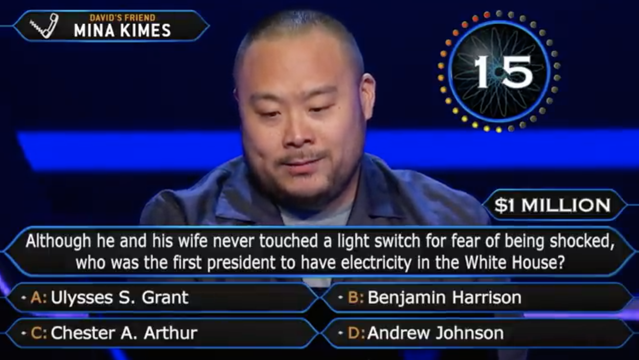 Ο σεφ Ντέιβιντ Τσανγκ έγινε ο πρώτος διάσημος διαγωνιζόμενος που κέρδισε ένα εκατομμύριο δολάρια στο τηλεπαιχνίδι «Who Wants to Be Millionaire» (Ποιος θέλει να γίνει εκατομμυριούχος).