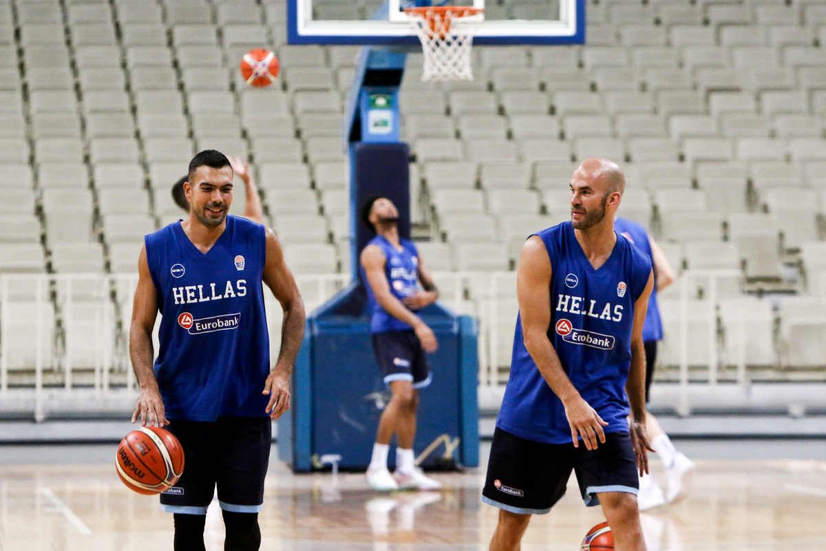Οι παίκτες της Εθνικής ομάδας μπάσκετ της Ελλάδας Κώστας Σλούκας (Α) και Νίκ Καλάθης (Δ) προπονούνται εν όψει των δύο αγώνων για τα προκριματικά του Παγκοσμίου κυπέλλου, με την Σερβία και την Γεωργία, μετά τη media day στο ΟΑΚΑ, την Τετάρτη 5 Σεπτεμβρίου 2018. ΑΠΕ-ΜΠΕ / ΑΠΕ-ΜΠΕ / ΓΕΩΡΓΙΑ ΠΑΝΑΓΟΠΟΥΛΟΥ