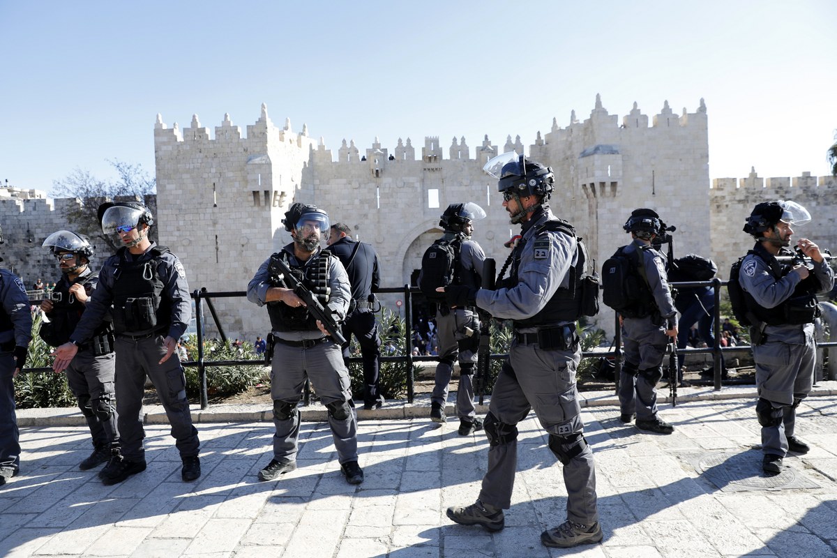epa06376910 Israel border police stand in position during a protest against the US recognition of Jerusalem as the capital of Israel at Damascus Gate in Jerusalem's Old City, 08 December 2017. Palestinians announced general strike and a rage day to protest against US President Donald J. Trump declaration recognizing Jerusalem as the capital of the Israel. EPA/ABIR SULTAN