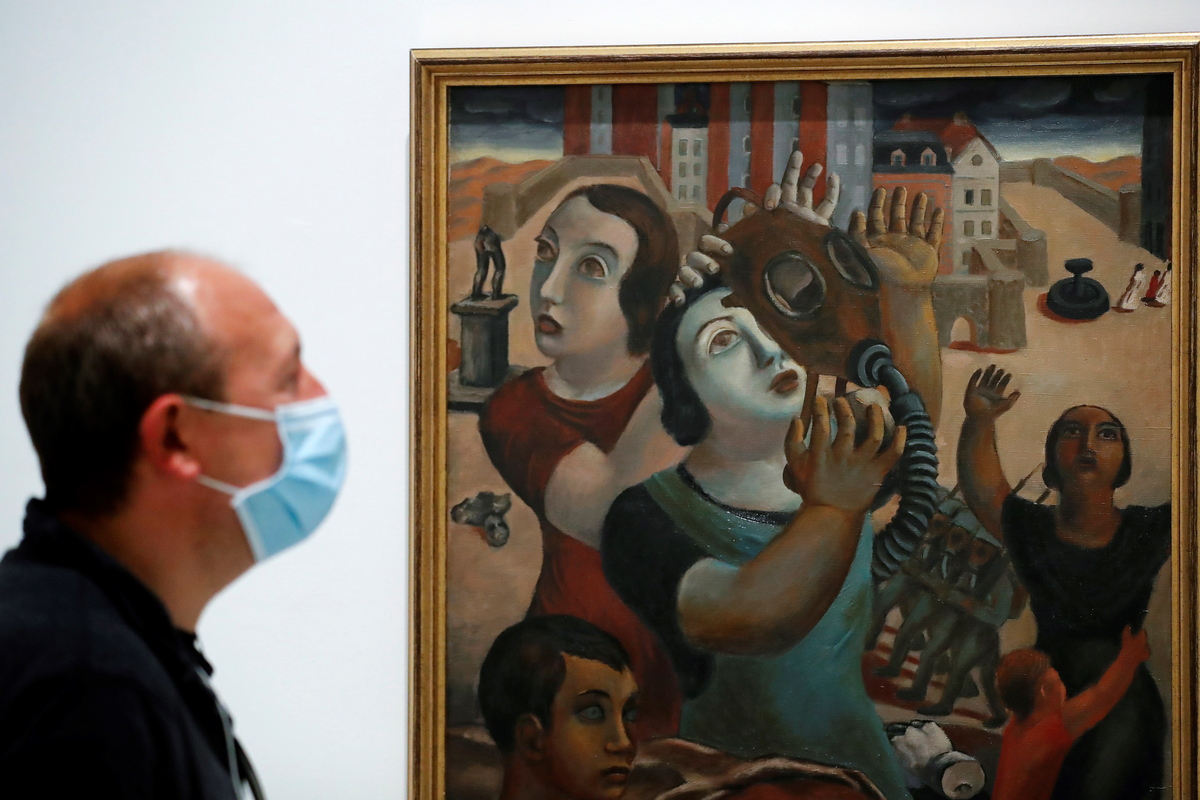 epa08468627 A man looks at the panting 'Allegory of War' by Chilean artist Isaias Cabezon, at the Reina Sofia Museum on its reopening day in Madrid, Spain, 06 June 2020. El Prado, Thyssen-Bornemisza and Reina Sofia Museums are reopening 06 June 2020 in the Spanish capital with new security measures implanted because of the coronavirus health crisis. EPA/CHEMA MOYA