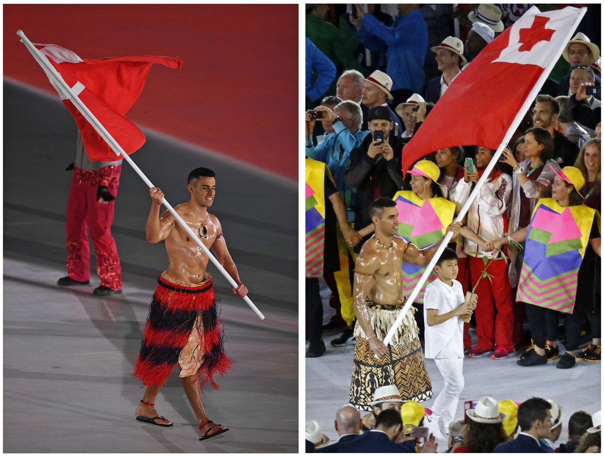 epa06509425 A composite image shows Tonga flag bearer Pita Taufatofua carrying the flag bare-chested both during the Opening Ceremony of the PyeongChang 2018 Olympic Games on 09 February 2018 (L) and the Rio 2016 Olympic Games on 05 August 2016 (R). Taufatofua was entering the opening ceremonies topless on both occasions. He competed in the Taekwondo competition at the Summer Games and will compete in the Cross-Country skiing competition at the Winter Games. EPA/VASSIL DONEV/TATYANA ZENKOVICH