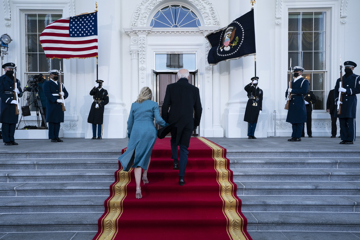 epa08954330 US President Joe Biden and first lady Jill Biden arrive at the North Portico of the White House, in Washington, DC, USA, 20 January 2021. Joe Biden was sworn in earlier on the same day and became the 46th President of the United States. EPA/Alex Brandon / POOL