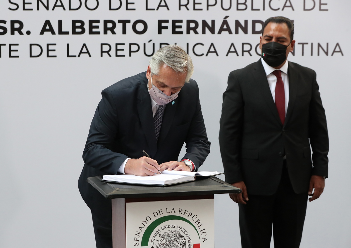 epa09032953 The president of Argentina Alberto Fernandez (L) signs the book of distinguished persons next to the president of the board of directors Eduardo Ramirez (R) during his visit to the Senate of the Republic, in Mexico City, Mexico, 23 February 2021. The foreign ministries of Mexico and Argentina signed on 23 February an agreement to reactivate their strategic association on political, economic and cooperation issues. EPA/Mario Guzman