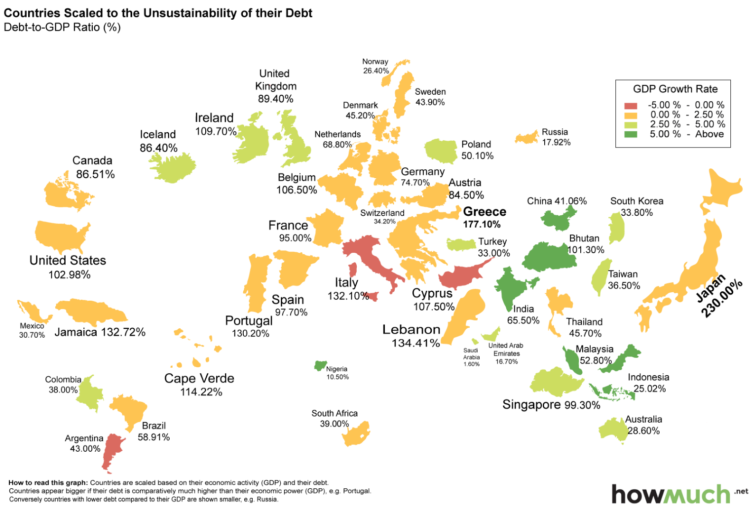 Στο χάρτη του HowMutch.net μπορούμε να δούμε με μια ματιά το χρέος κάθε χώρας σε σχέση με το ΑΕΠ της. Στον Άτλαντα αυτό παρουσιάζονται όλα τα προβληματικά παιδιά του καπιταλισμού, ενώ σε περίοπτη θέση βρίσκονται και χώρες υπεράνω κάθε υποψίας.