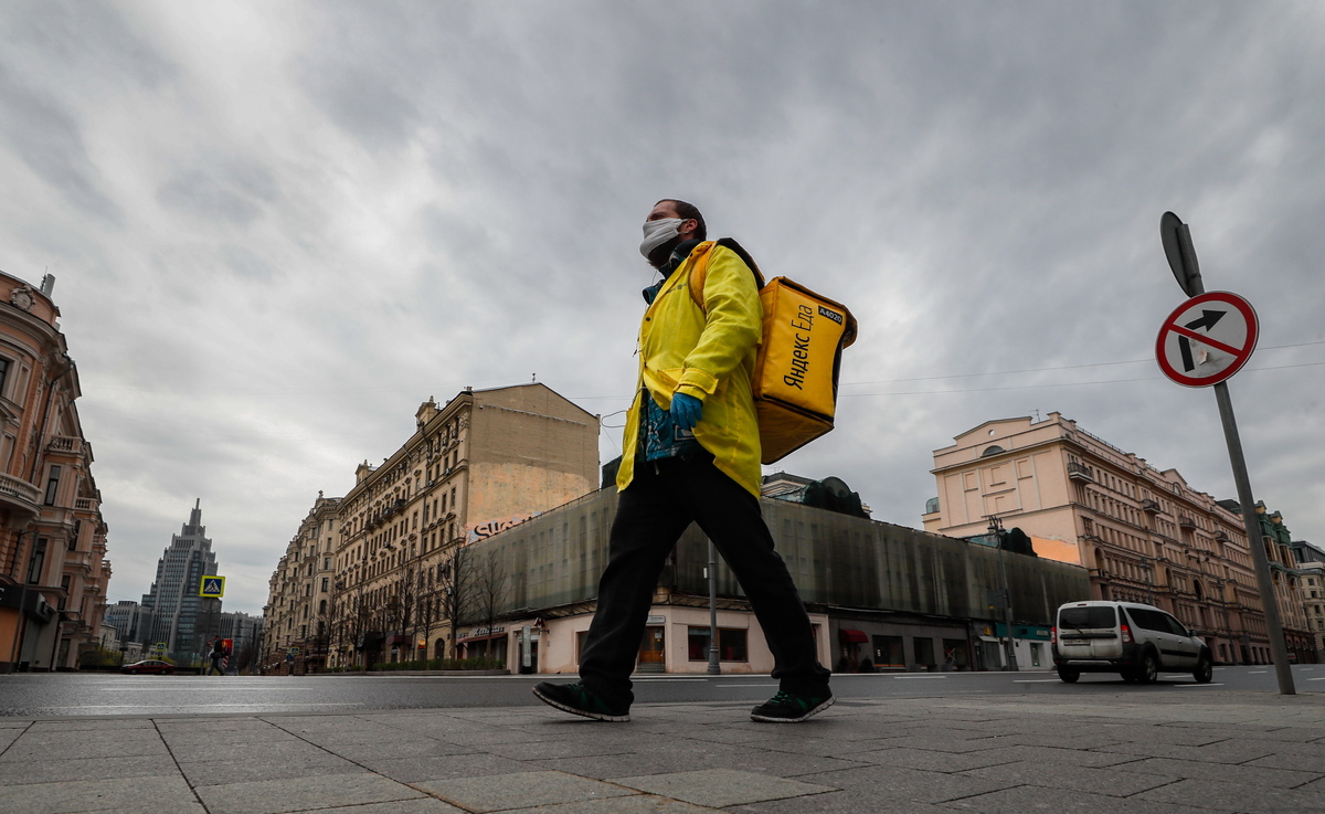 epa08399729 A food delivery man, wearing protective face mask, walks in downtown Moscow, Russia, 04 May 2020. Russian President Vladimir Putin extended the stay at home order to 11 May 2020 to prevent the spread of the SARS-CoV-2 coronavirus which causes the COVID-19 disease. EPA/YURI KOCHETKOV
