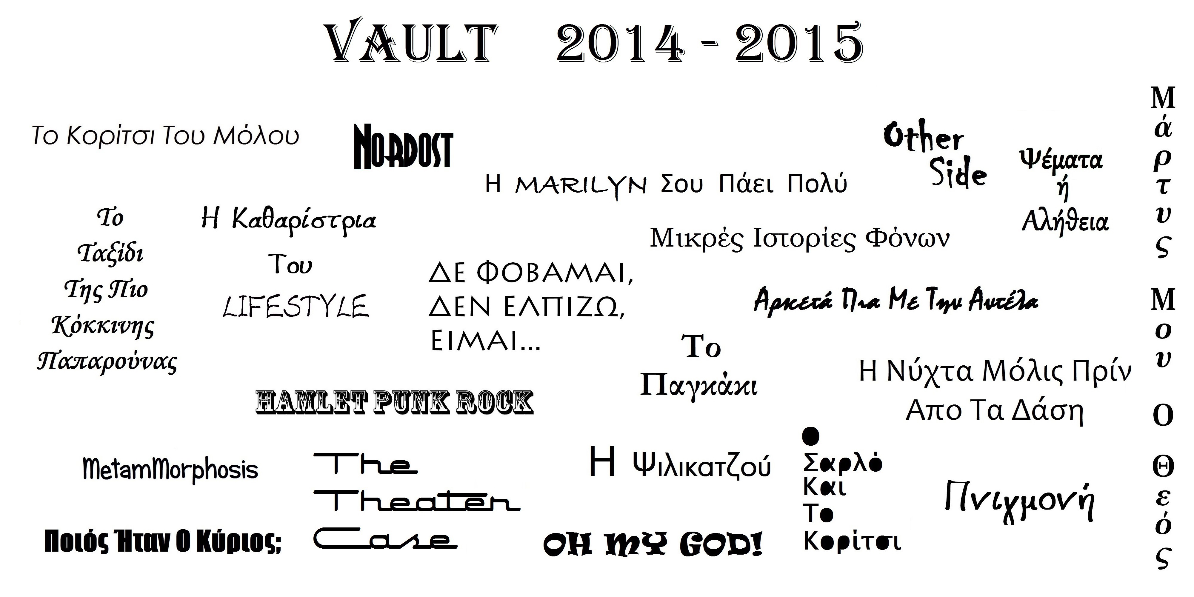 Ο Πολυχώρος Vault πιστός στο στόχο του να σχολιάσει και να προβάλει τη σύγχρονη κοινωνικοπολιτική πραγματικότητα καθώς και να προσφέρει σε νέους καλλιτέχνες ένα χώρο προβολής και ανάδειξης της δουλειάς τους, τη σεζόν 2014-15 δίνει έμφαση στο νεοελληνικό έργο και παρουσιάζει μια σειρά από έργα νέων δημιουργών με σύγχρονη ματιά, δράμματα και κωμωδίες και παραστάσεις για παιδιά.