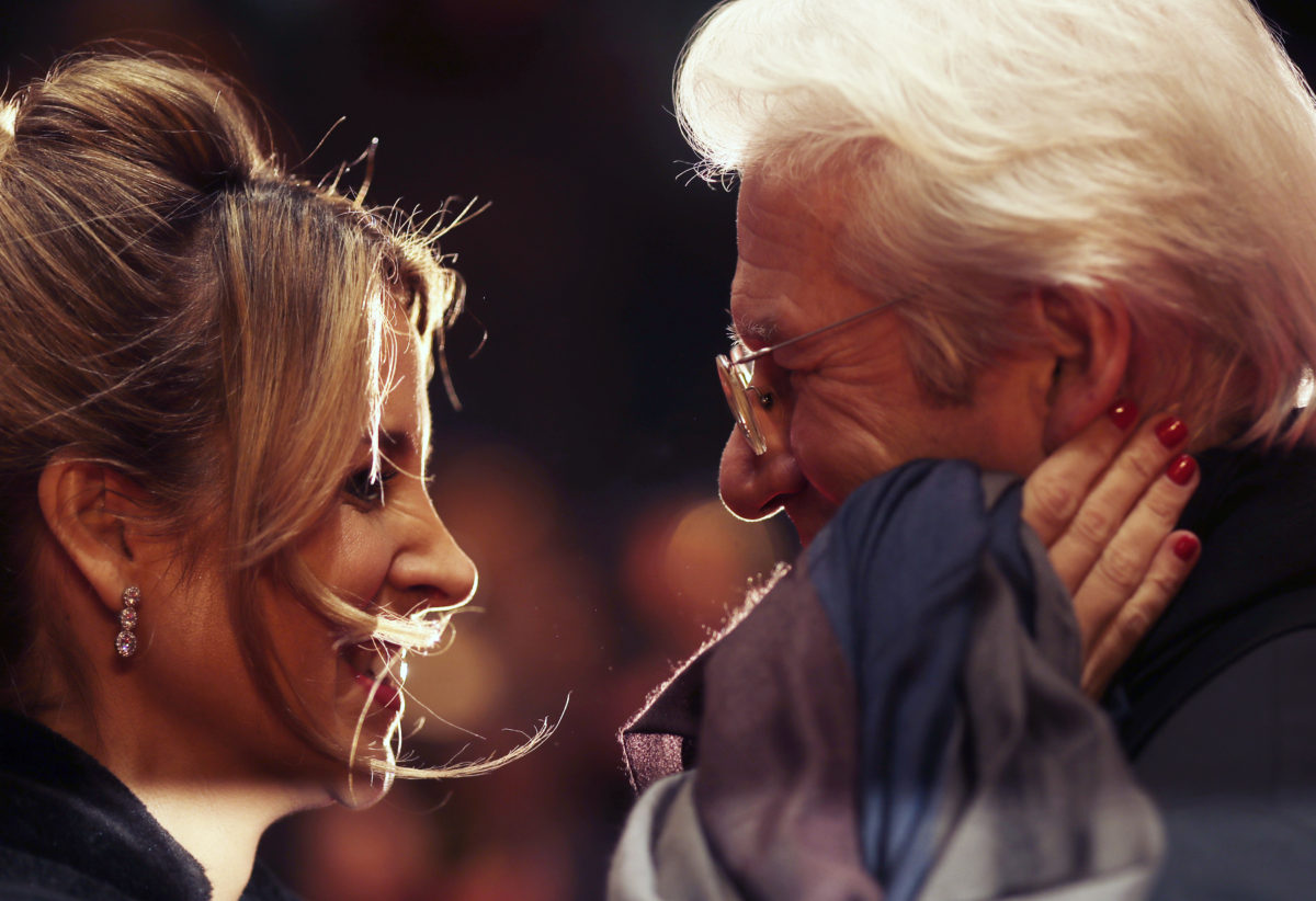 Actor Richard Gere and his girl friend Alejandra Silva pose on the red carpet for the film 'The Dinner' during the 2017 Berlinale Film Festival in Berlin, Germany, Friday, Feb. 10, 2017. (AP Photo/Markus Schreiber)