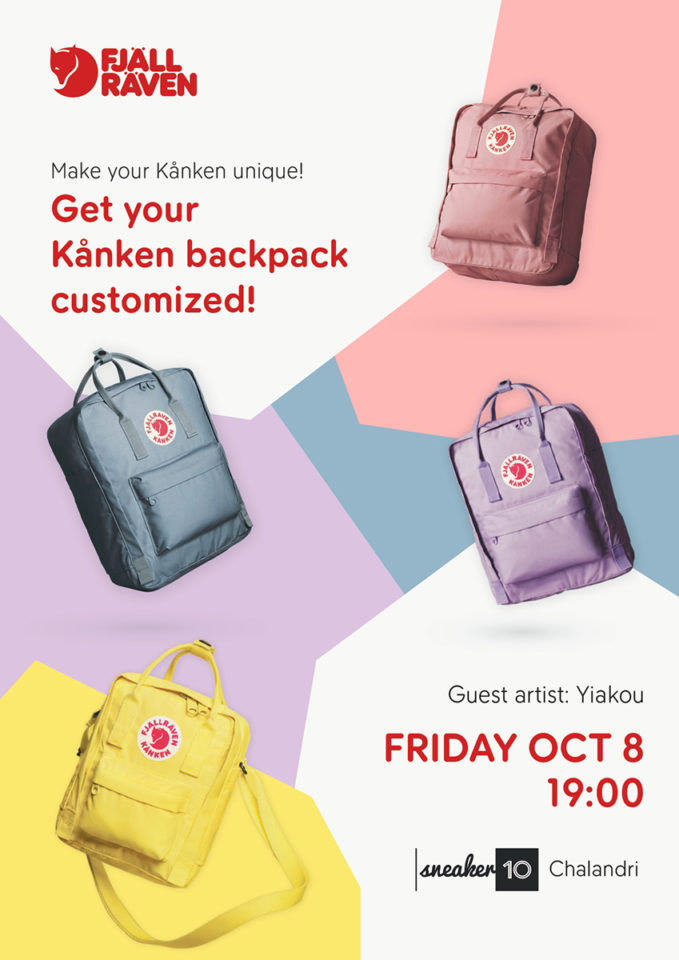 Η Kånken, η cool αλλά και οικολογική backpack της σουηδικής μάρκας ρουχισμού και εξοπλισμού για δραστηριότητες στη φύση, Fjällräven,  προσκαλεί μικρούς και μεγάλους να έρθουν την Παρασκευή 8 Οκτωβρίου στο αγαπημένο κατάστημα των sneaker-addicts στο Χαλάνδρι, το Sneaker10 (Αγίας Παρασκευής 11), για μία μοναδική customization εμπειρία της backpack τους από έναν καλλιτέχνη!
