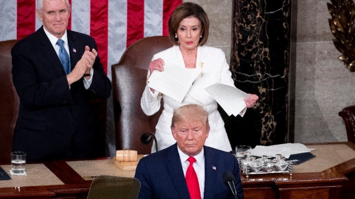 Στο τέλος της 80λεπτης ομιλίας του στην κοινή συνεδρίαση του Κογκρέσου, η Πελόσι σηκώθηκε και έσκισε το αντίγραφο της ομιλίας του Τραμπ που ο ίδιος της είχε δώσει, υπό τα βλέμματα εκατομμυρίων τηλεθεατών.